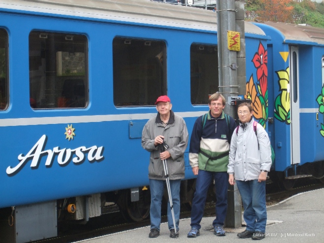 Drei Viertel der Reisegruppe vor dem Arosaexpress im Endbahnhof Arosa; 06.10.07