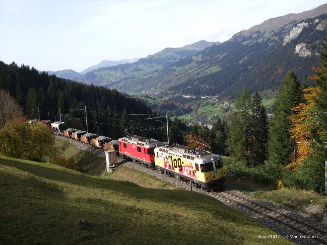 Blick ins Prättigau und auf Ge 4/4 II 611und 623 in Doppeltraktion mit schwerem Güterzug # 5047 oberhalb des Cavadürli - Tunnel; 05.10.07